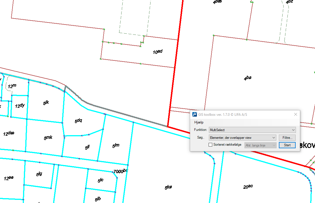 Denne funktion er specielt anvendelig, hvor man ønsker at finde alle de jordstykker hvor en liniestreng knækker (masteplaceringer mm).