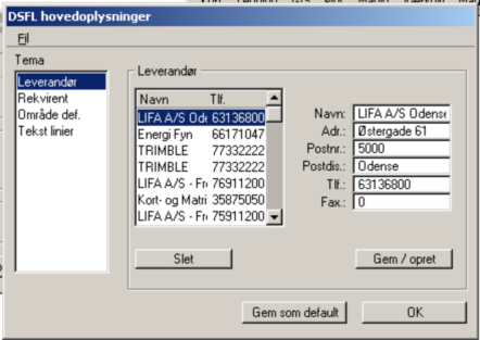 Der gives mulighed for at vælge en default leverandør, ved at sætte ’flueben’ i dette felt. Den leverandør der er valgt som default værdi, vil automatisk blive indsat i DSFL-filen som leverandør, hvis der ikke vælges en anden.