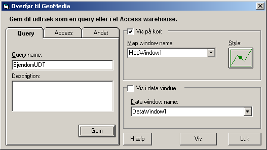 Funktionen åbner vinduet Overfør til GIS (se herunder)
