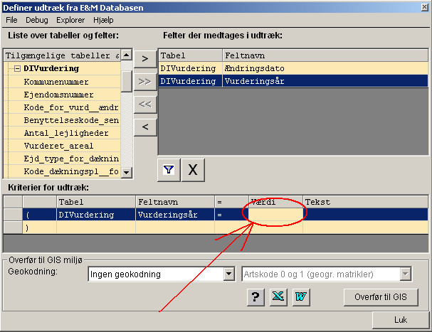 Når et felt er overført til kriterie listen, skal værdien, som skal indgå i filtreringen, indtastes: