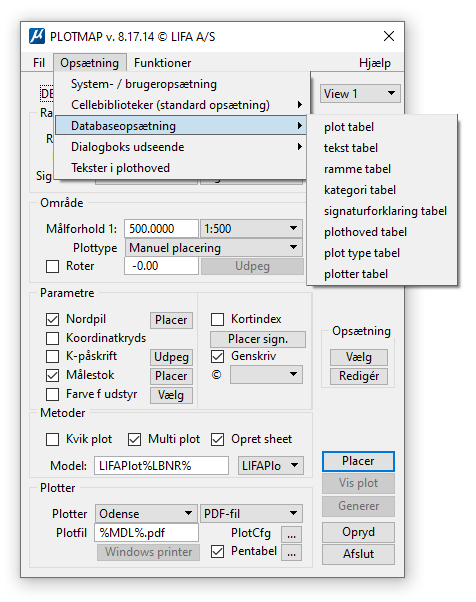 Tilpasning af PLOTMAP sker dels i cellebiblioteker, der indeholder det grafiske udseende af kortudstyr, dels i databasetabeller, der indeholder system opsætning, brugerdialog, samt oplysninger om genererede plot og tilhørende tekster, og dels under Opsætning menuen, hvor der defineres ledetekster og diverse parametre, som gennemgået i afsnit 1.8 Opsætningsmenu.